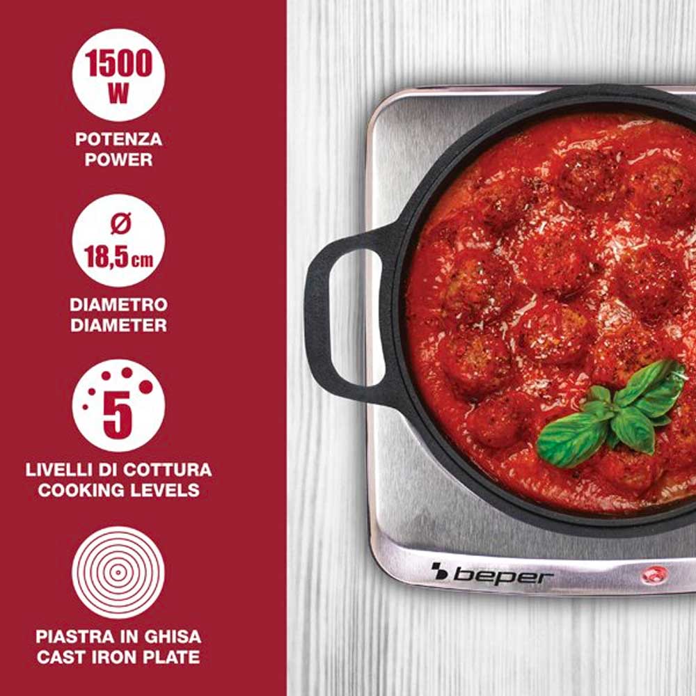 Fornello elettrico con corpo in acciaio e piastra in ghisa dal diametro di 18,5 cm, ideale per cucinare in spazi ridotti o durante i viaggi. Dotato di termostato regolabile su 5 livelli di temperatura e spia luminosa di funzionamento. La protezione contro il surriscaldamento e i piedini antiscivolo garantiscono maggiore sicurezza e stabilità durante l’uso. La potenza di 1500W assicura prestazioni ottimali in ogni situazione.