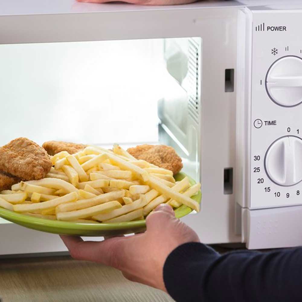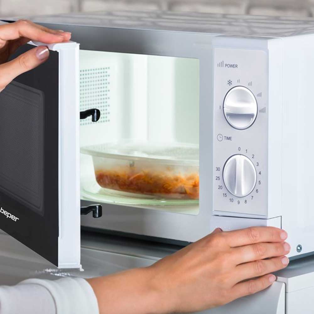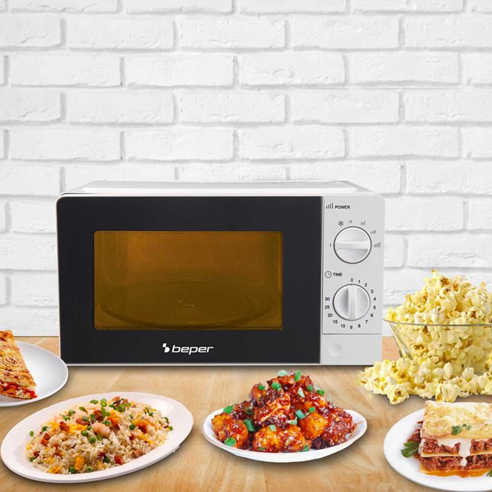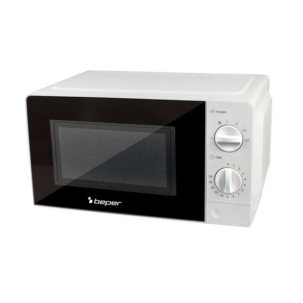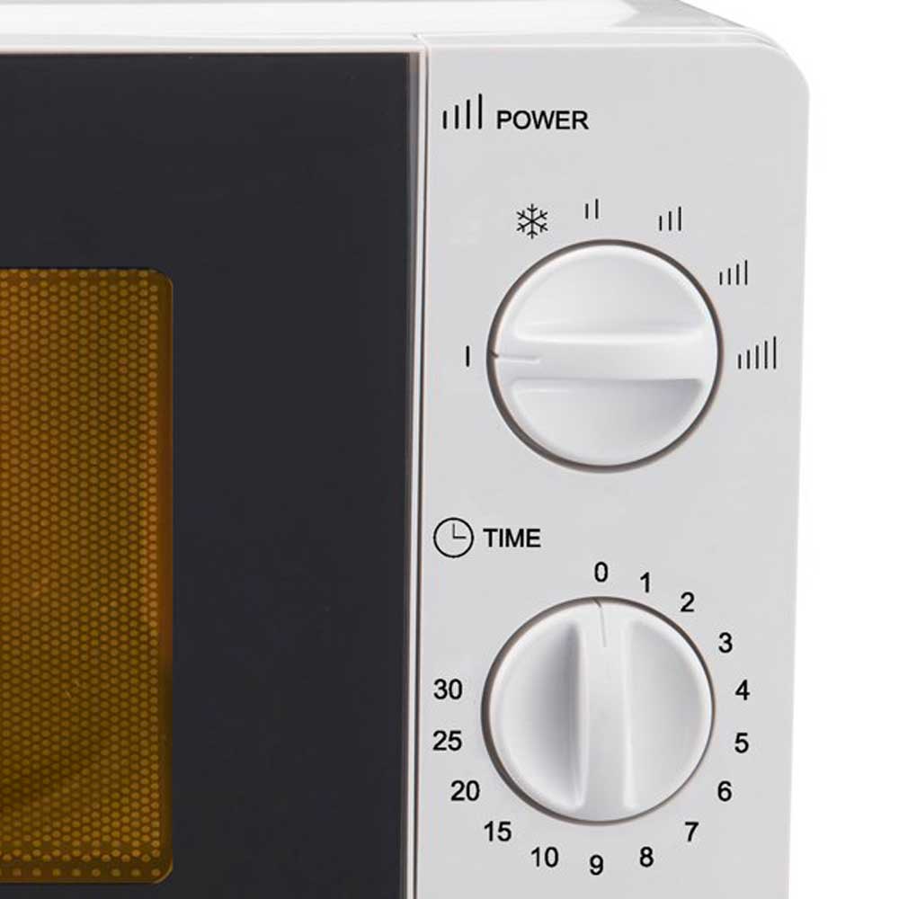 Forno microonde bianco da 20 litri, pratico e compatto, ideale per ogni cucina. Dotato di piatto girevole in vetro da 24,5 cm, illuminazione interna e funzione scongelamento, offre 5 livelli di potenza e timer fino a 30 minuti con autospegnimento. Facile da usare grazie all’apertura a pulsante, ha una potenza di 700W e dimensioni contenute (44,5x34,5x24 cm). Realizzato in ABS e vetro, combina efficienza e design essenziale.