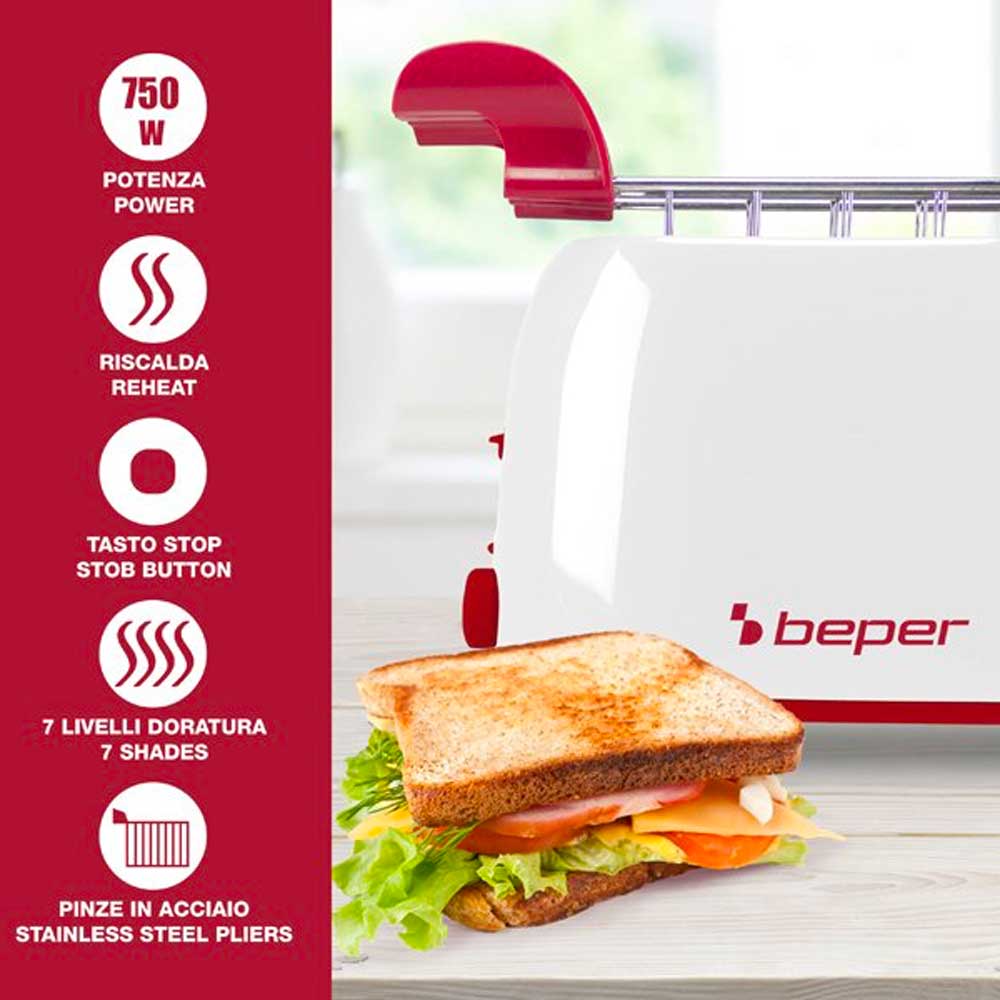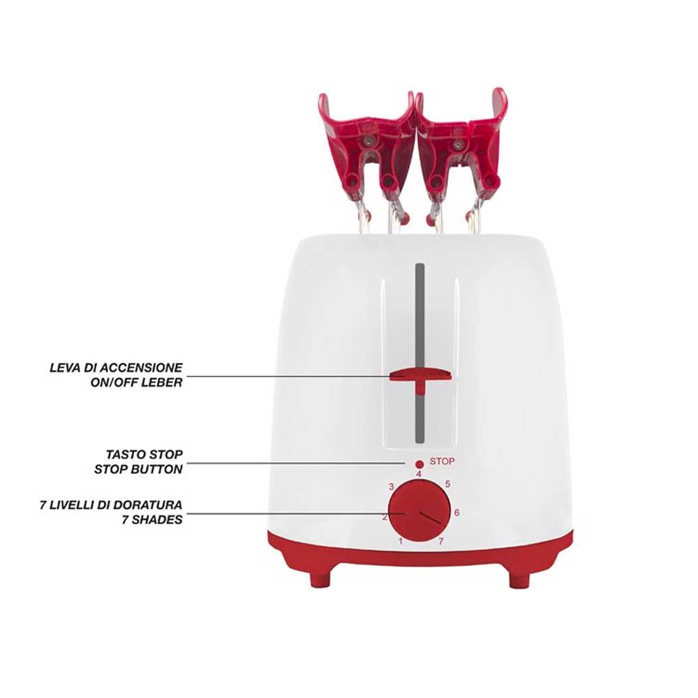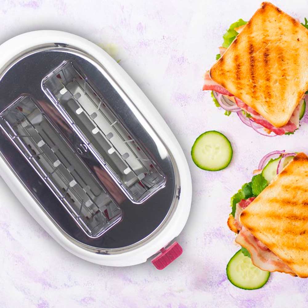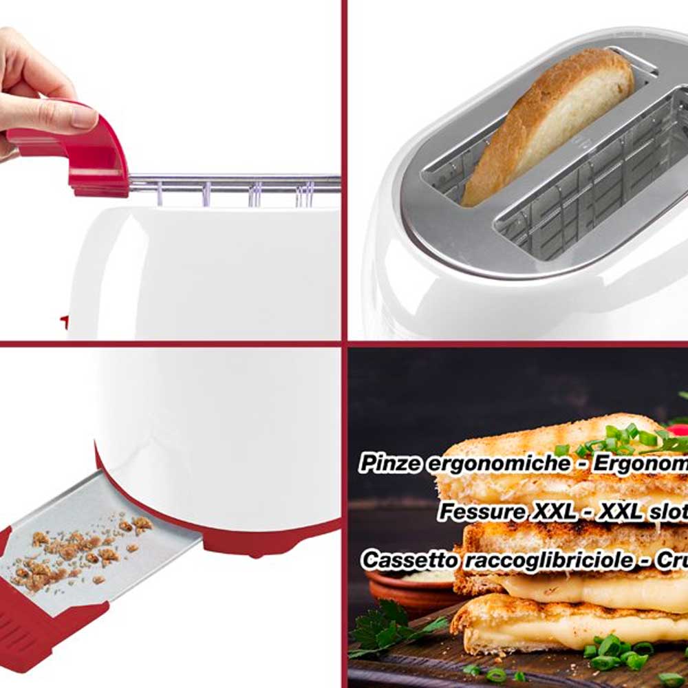 Tostapane a due fette da 750 W, ideale per preparare toast farciti grazie alle pinze in acciaio con impugnatura ergonomica. Le fessure extra larghe permettono di inserire fette fino a 3,5 cm di spessore. Offre 7 livelli di doratura, autospegnimento a fine cottura e pulsante Stop per interrompere la tostatura in qualsiasi momento. Dotato di cassetto raccogli briciole estraibile e avvolgicavo integrato, è realizzato in plastica e acciaio per unire praticità e durata.